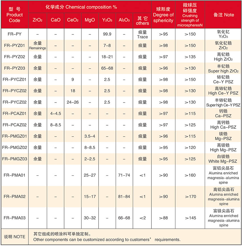 The company can produce yttrium oxide spray powder, YSZ spray powder, Mg-PSZspray powder, Ca-PSZ spray powder, cerium-yttrium co-stabilized zirconia spray powder, high yttrium zirconium oxide spray powder, high magnesium zirconium spray coating, magnesium aluminum spinel spray coating and other different thermal spraying materials. Thermal spray coating is widely used in diesel engine piston, valve, cylinder, heat shield, turbine blade, ship anti-corrosion, environmental protection, chemical machinery and other industries.